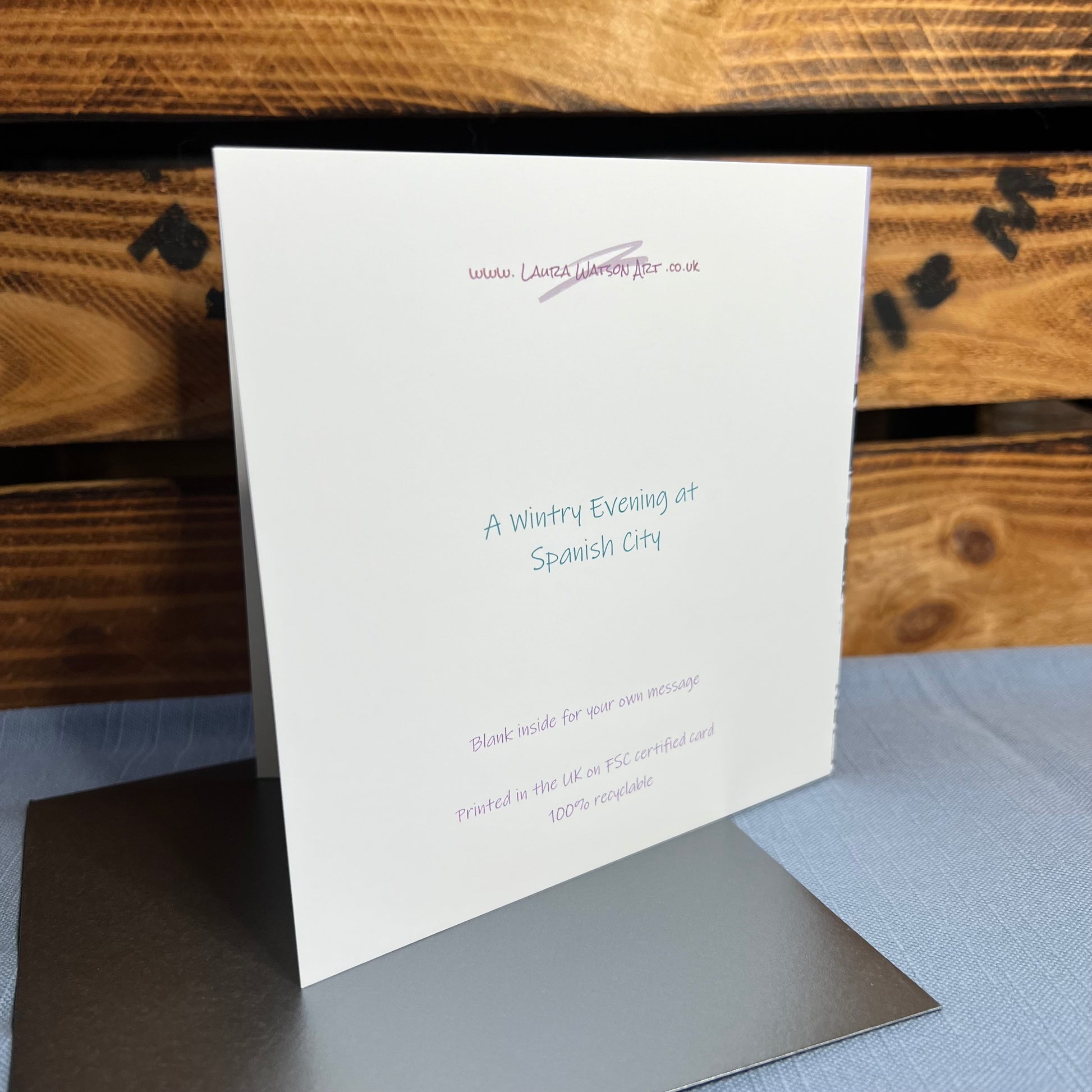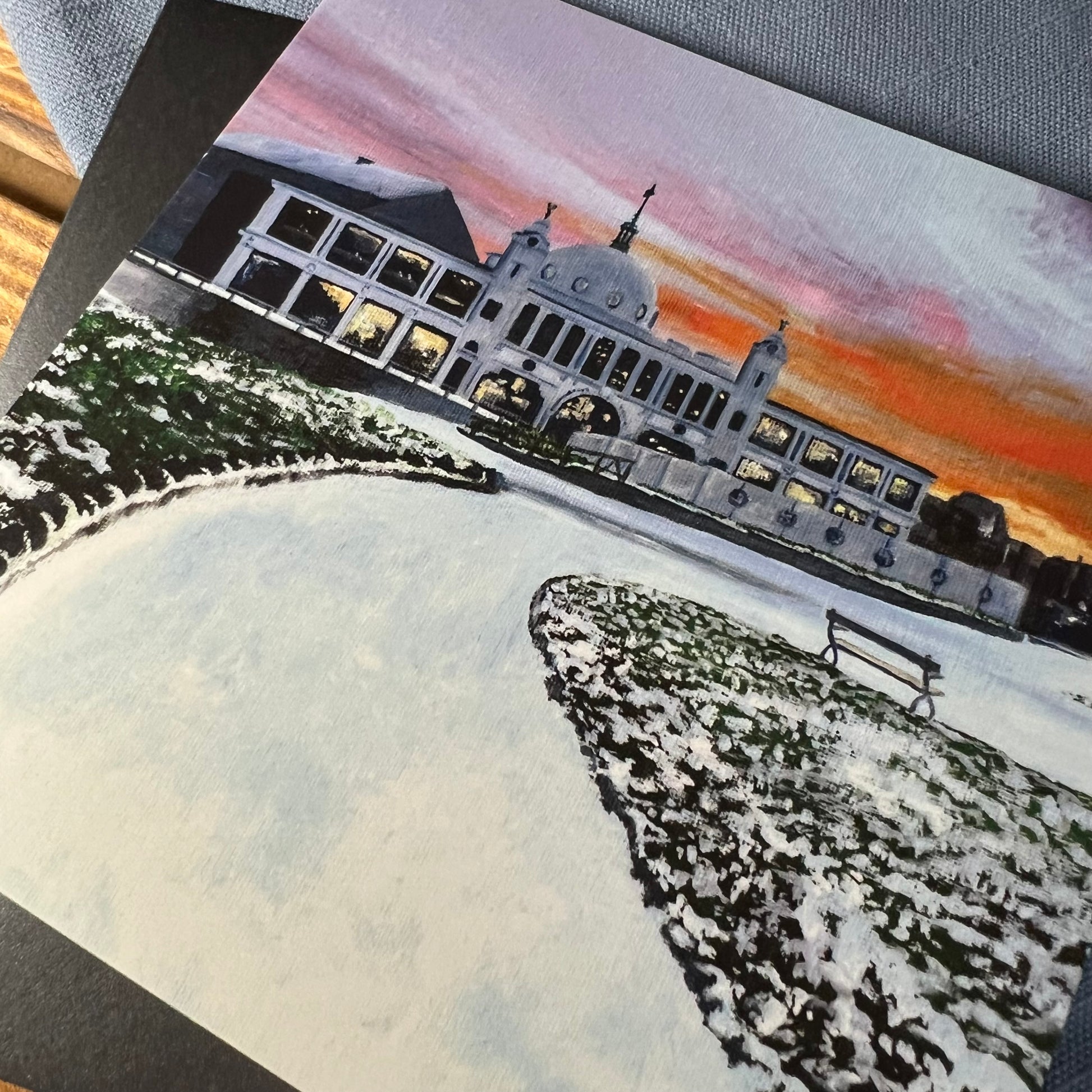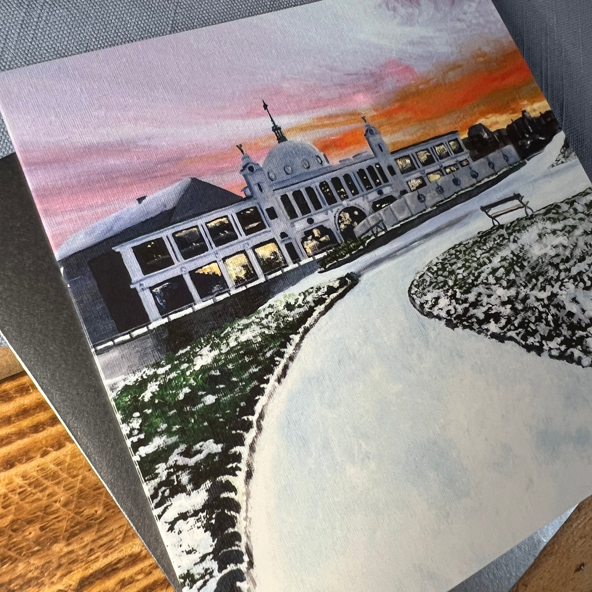 Square Christmas card of the Spanish City, Whitley Bay, against a snowy winter sunset. The image is taken from one of my original paintings.