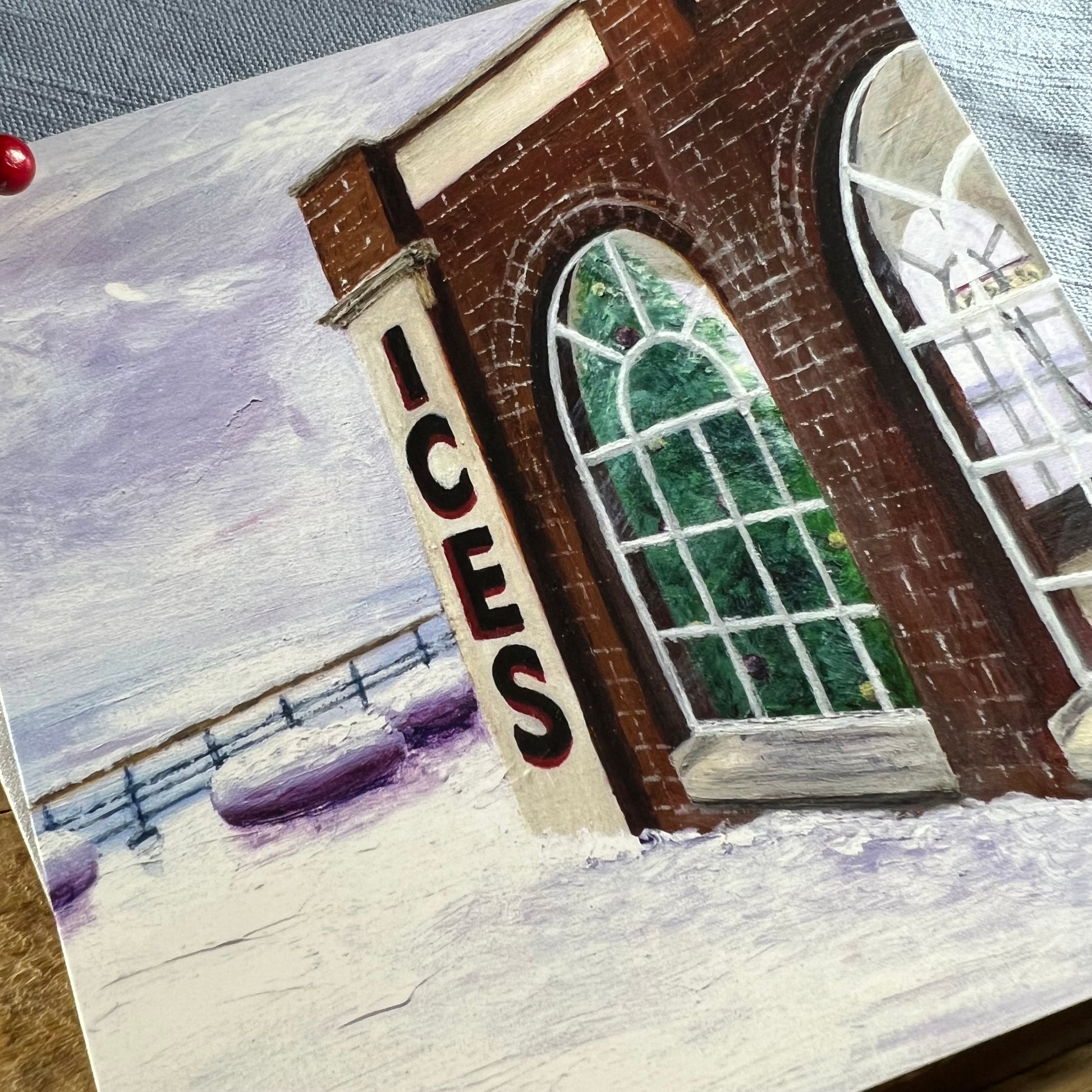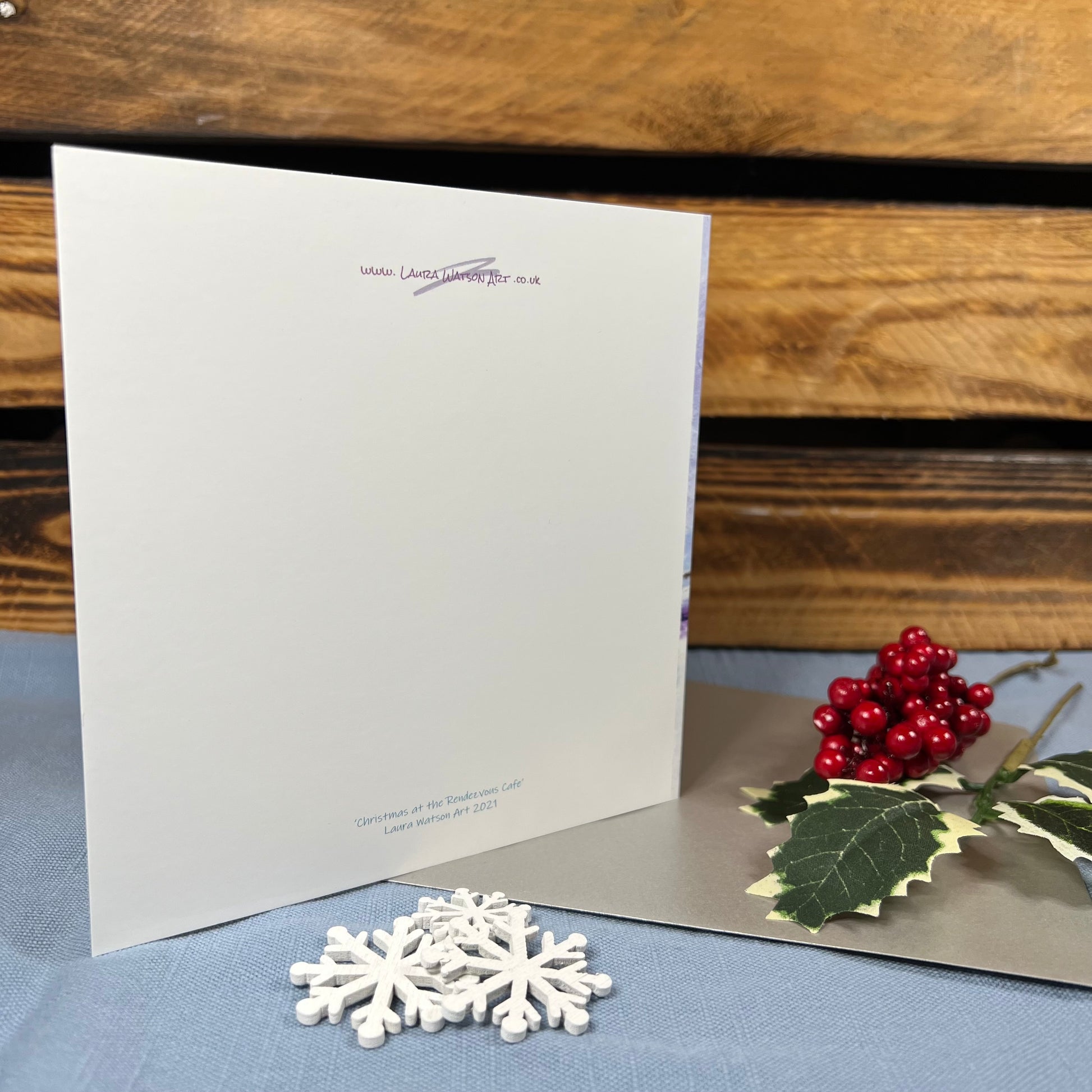 Square Christmas card of the Rendezvous Cafe, Whitley Bay, at Christmas. The image is taken from one of my original paintings.