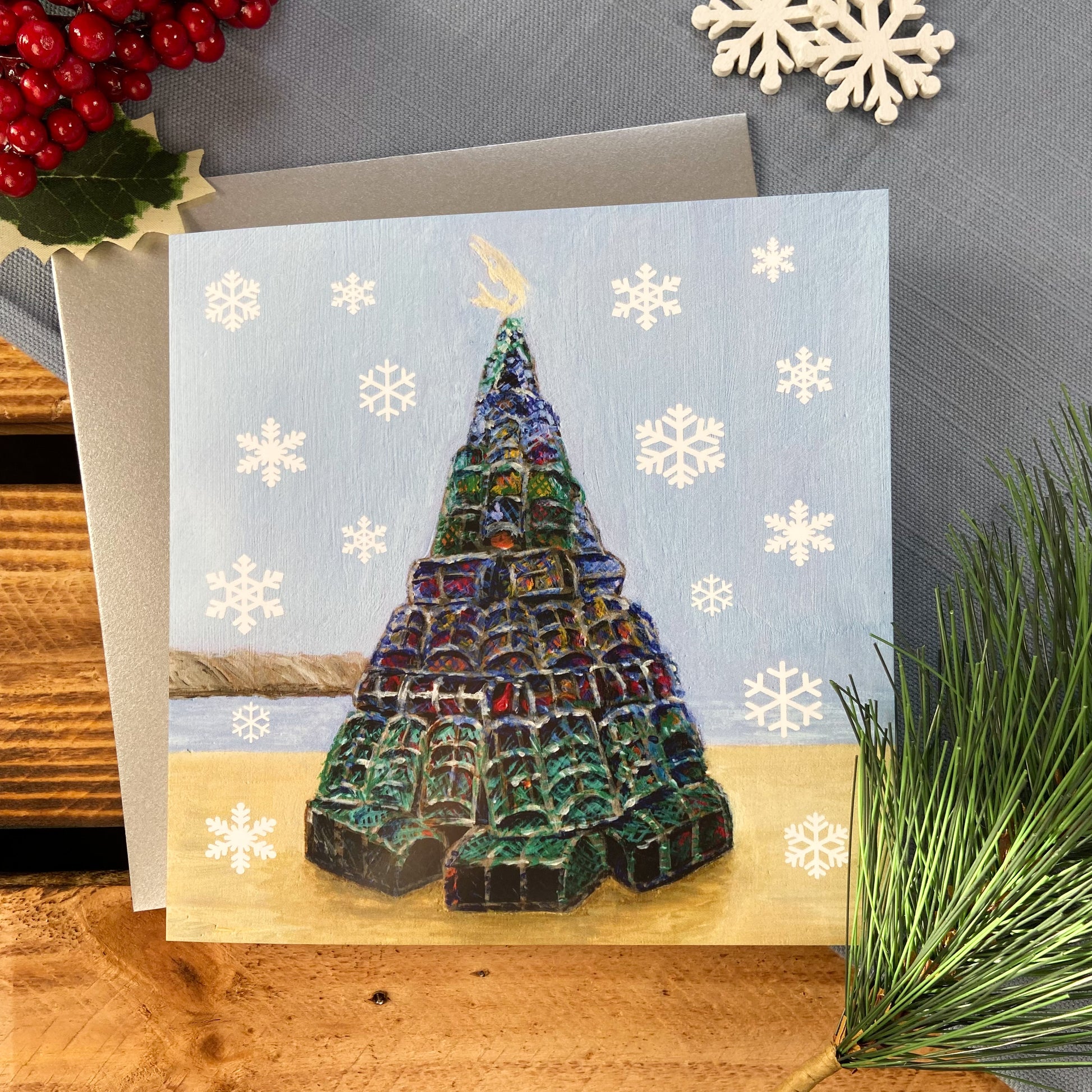 Square Christmas card of the famous 'Fishtive Tree' on Filey sea front. The image is taken from one of my original paintings, and also features digitally-added snowflakes.