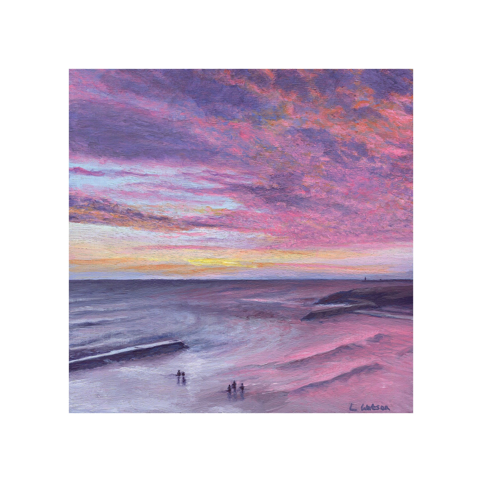 Mounted giclee print of sea swimmers at Cullercoats Bay beneath a stunning sunrise. This image is taken from one of my original acrylic paintings. It's printed on top quality 310gsm art paper using Epson pigment inks, meaning the colours will stay true for years. Each print is individually signed.