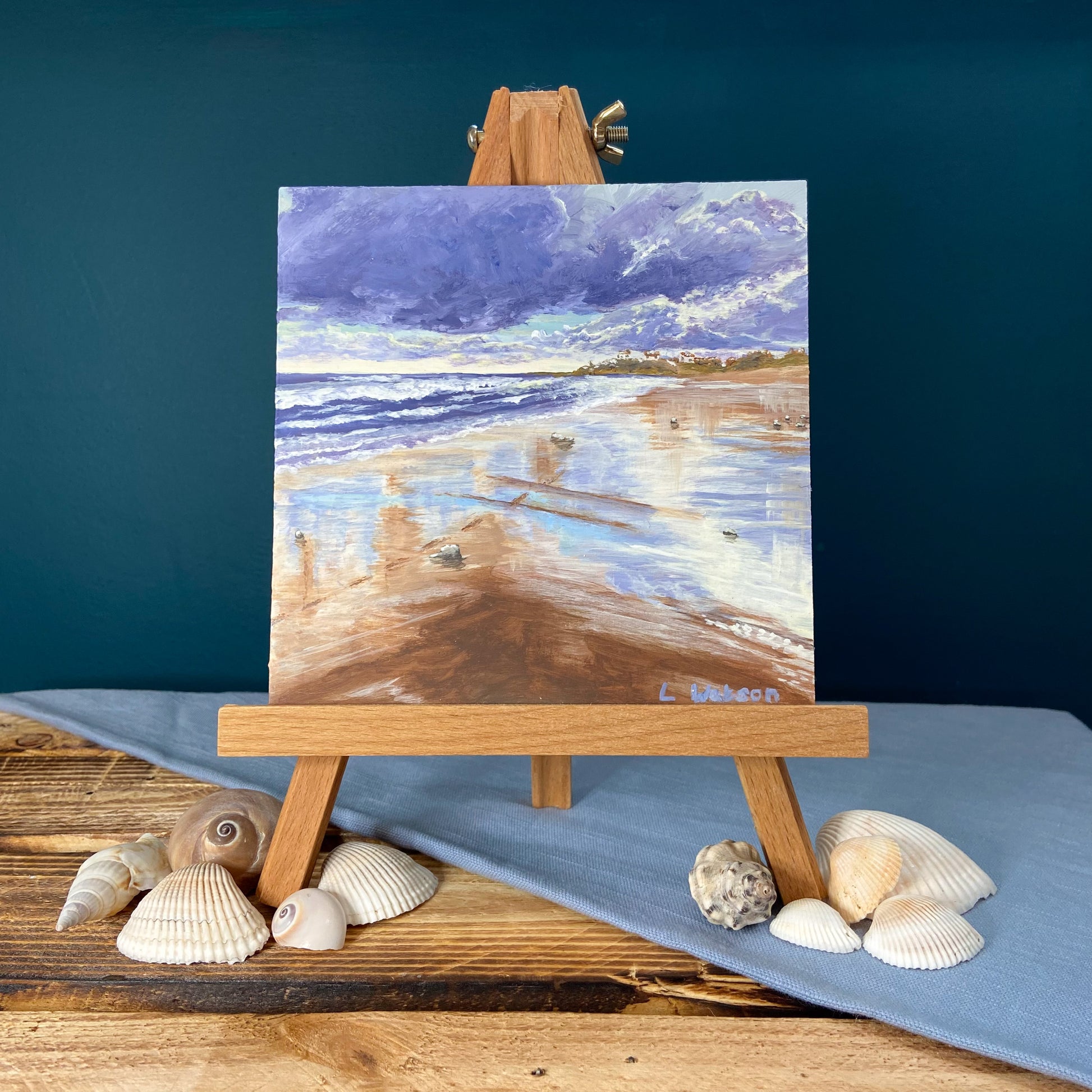 Mini original acrylic painting of winter sunlight over Seaton Sluice beach, with Seaton Sluice village visible on the horizon. This composition has been painted on primed wooden panel. It can be placed on a shelf or windowsill on its display easel, or it can be framed and hung on a wall in almost any room.