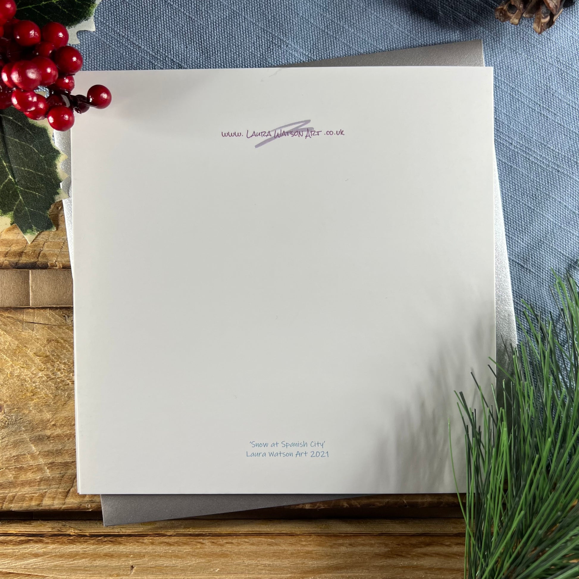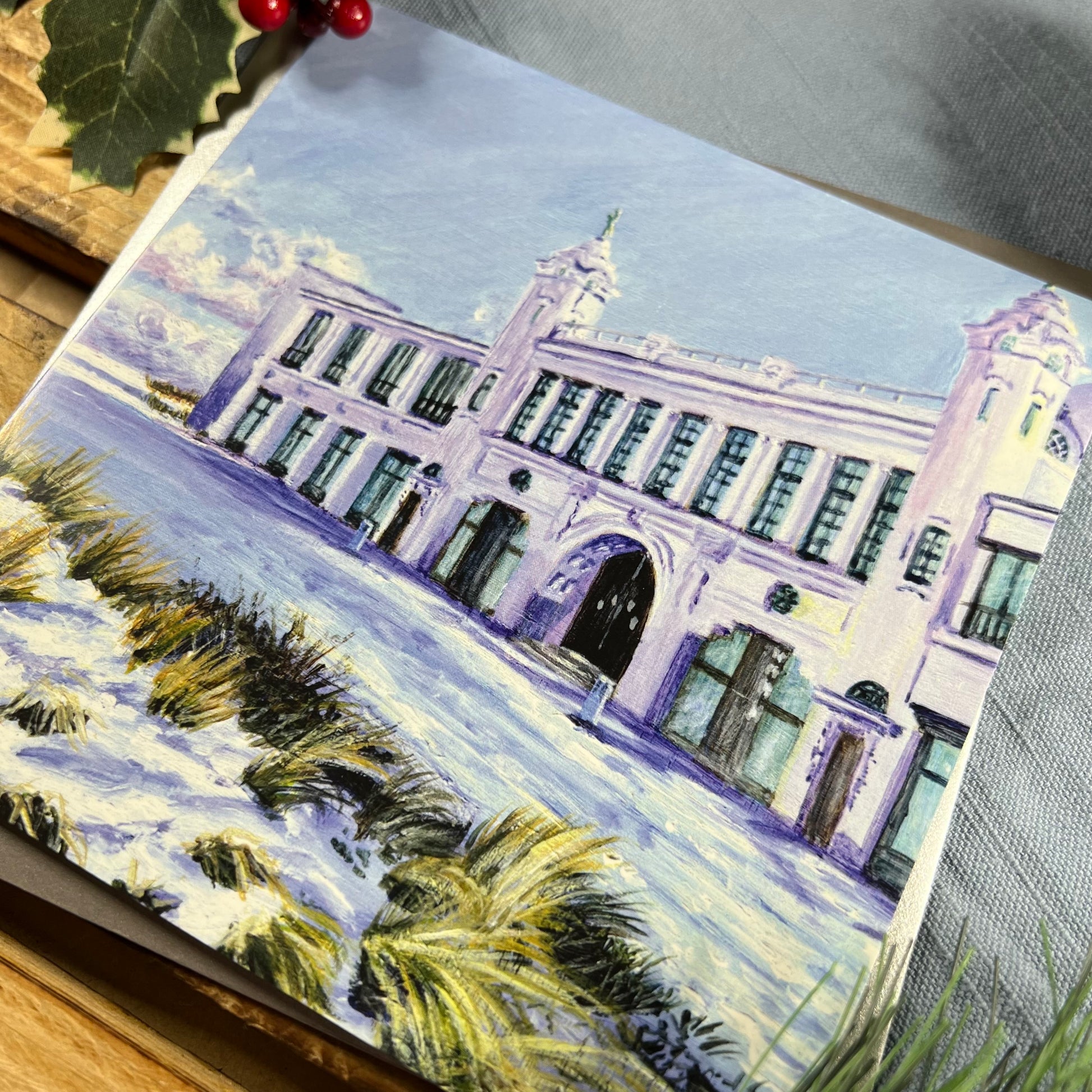 Square Christmas card of Whitley Bay's iconic Spanish City in the snow. The image is taken from one of my original paintings.