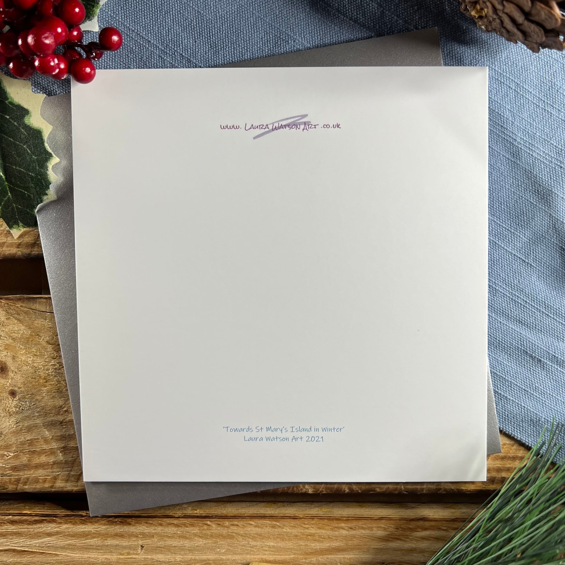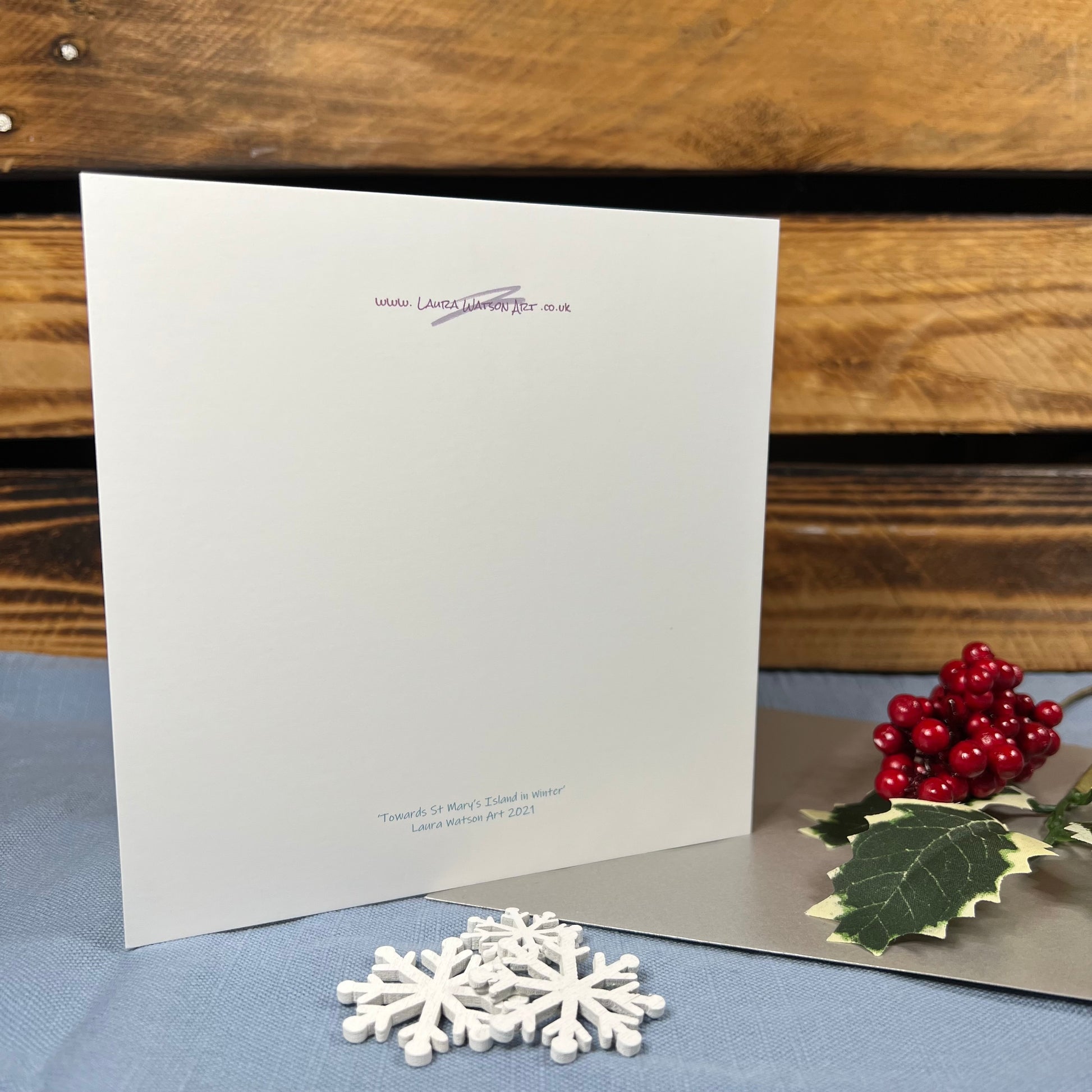 Square Christmas card of the view towards St Mary's Island, Whitley Bay, on a snowy day. The image is taken from one of my original paintings.
